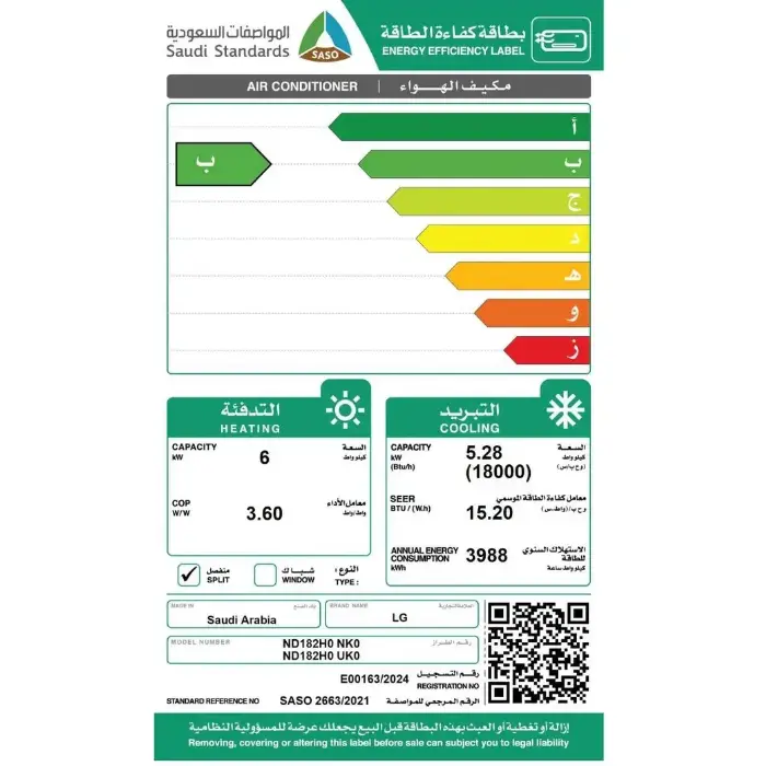 مكيف ال جي سبليت 18000 وحدة – انفرتر wi fi- حار و بارد ND182H0UK0