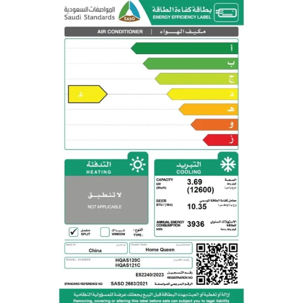 مكيف هوم كوين سبليت 12600 وحدة – WIFI – بارد HQAS120C